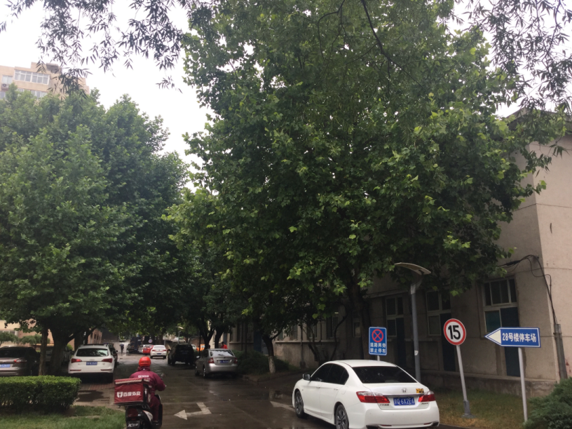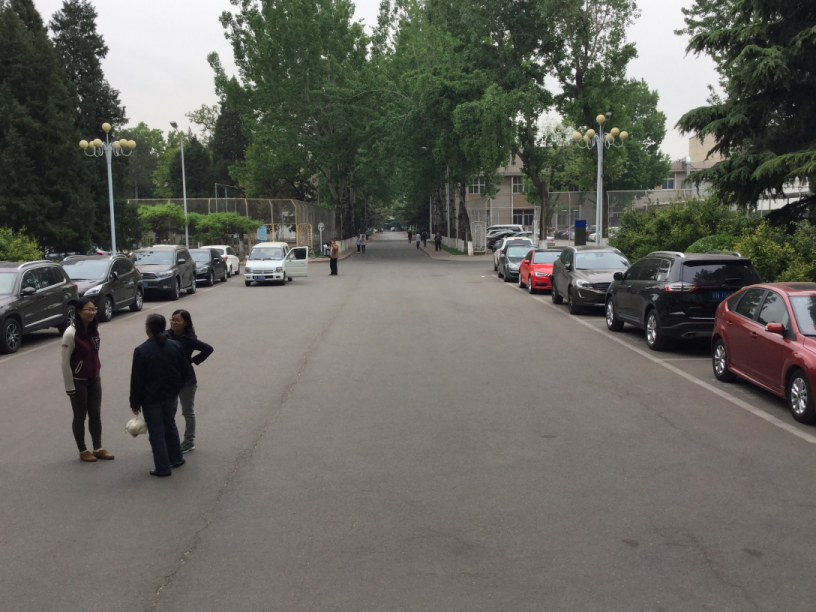 宇宙線関係の人は本館にいるらしいが, 黄さんの研究室だけは本館か ら少し離れた建物にある. 地図では本館の左上の方で,アパートから は黄色の線を辿って行く(10分くらいかかる). その建物の角に到着すると,“28号楼停車場” の看板がある(写真の白い自動車の右の青地の看板). しかし,写真の右手の木立に隠れたASgの建物は28号楼ではない. 28号楼は写真左上に顔を出している高能研最大の 高級アパート/マンションである.これについてはまたあとで触れよう(7.1).