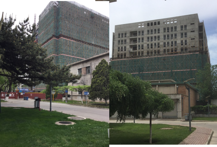Figure 3: 建築中の新館.最初これで年内に完成?と見えたが (左),最近,周りの足場もどんどん外され(右)だいぶ進捗の様子だ. ただ,周りの塗装などはまだなのに,足場をはずしてしまって いいのかいな,と素人ながら心配