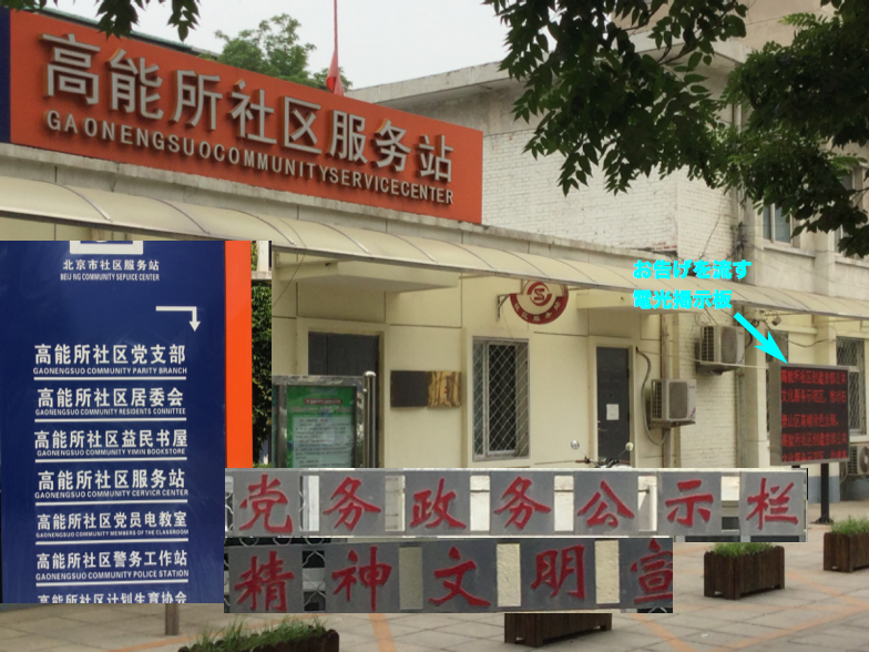 電光掲示板のお告げ以外に,「党務政務公示板」, 「精神文明宣伝板」といったものもある.いかにも厳(イカメ)しいが, 前者に張り出されていたのは,どこかに「遠足」に行った際の 写真,後者は「ゴミ出し」,「賄賂」,「交通事故」,... などに関する「注意」喚起のようなマンガがであった.