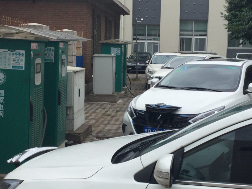 本館裏の駐車場内には,電気自動車の充電設備があり, 4台まで充電可能であるが,いつも写真のように3,4台が充電中である(直流充電). 時にはタクシーもやっている.