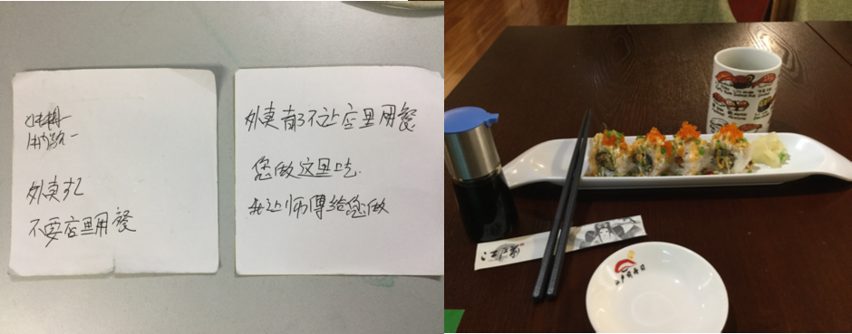 だが,ここで,持ち帰りの中国語としてごく最近覚えた 「打包(ダーバオ)」が思い浮かんだ.ここで打包を使ってみよう. 打包なら特色寿司OKかと聞く(ダーバオとOK以外は身振り手振り). するといいよという返事(らしい).店内に座っていてはまずかろうと 思って,立ち上がると,座っておれということで,「チョトマテクダサイ」と なった.しばらくすると,ついて来いといわれて,別室に案内された. 誰もいないかなり広い綺麗な部屋.そこで座って待てとのこと.なにやら 書いてくれたのが,写真の文章の右の方のものである. これもチンプンカンプンだが,身振りから どうも「ここで食って行きんしゃい」, という感じなので,身振りで聞いてみると 当たりらしい.醤油やお茶のお代わりも出してくれて(写真右) 思わぬ所で「おもてなし」を受けてしまった. 貧相な日本人が安い寿司を食いに来た.打包の 品を他のお客のいる所で一緒に食わせてはまずい,というので 別室に案内されたらしい(*). 大阪とか京都とかの名前のついた別室なども 他にいくつかあり,相当大きな寿司屋であった.