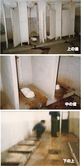 高能研究所内部はましであったが,仕切りはあったが ドアがまともであったかどうか記憶が朧である. 田無の核研,宇宙線研時代に高能研を訪れた某女史は ホテルに帰るまで用足しは我慢したと,聞いた. 右図は当時の典型的なトイレの写真である.おそらく 「上の並」は高能研のもの.「下の上」は上記の 美術館よりマシである.ちゃんと掃除はされ,物の道 などはない.