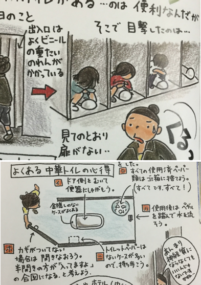 理由は紙が水溶性でないので,詰まってしまい,えらいことになる, ということらしい.ある女性の書いたマンガチックな北京案内の 本 (北京へ行きたい! ごとうゆき著,メイツ出版:2008年販) も買って持って来たが,その著者も詰まらせて えらい目にあったと書いている. 水溶性の紙ならOKなら 変更はすぐにでもできそうなのだが,習慣でもう 特に不便など感じないから,続いているのだろうか. 上記の本の良いところは,他の案内書にはない,トイレの真実が ちゃんと書いてあるところである.版権の問題もあるので その漫画の一部だけを載せておいた.