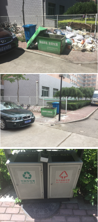 すぐそばの 留学生公寓の前には小さなゴミ箱があり, 緑(Recyclable)と赤(Not-Recyclable), と 分別を指定した小さな箱はあった(写真下段). ただし,なにがリサイクル可能かは書いてない. この大きさではアパート住民のゴミには小さすぎる.