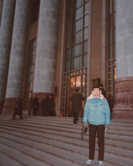 そんな大会堂の中に入れるというので,地下鉄で西単から1駅とかだから, アメちゃん(雨森氏)と喜び勇んで訪れた, 天安門西駅から歩いて行くと,会場に向かって歩いて行く人は 誰もいない.気が付くと, 皆黒塗りのハイヤーでカッコよく乗り付けているではないか. どうやら歩きで来たのは我々だけだったようである. N先生が何かの表彰式か,祝賀会で皇居に招かれた時, 「皆な黒塗りのハイヤーで乗り付けていたが, 普通のタクシーで来たのは俺だけだった」, という話を思い出した. 写真は大会堂入り口で: こんな格好の参加者は他には いなかってであろう.アルバムには, 耳あてはヒットだったと書いてあった.