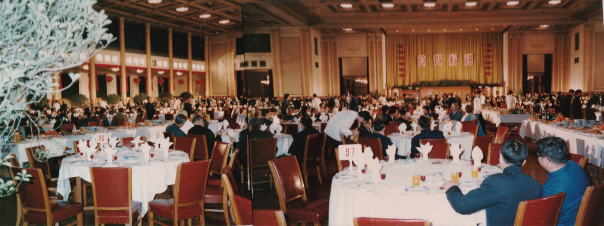 1984年の春節時に高能研に滞在したおり, 高能研に滞在する外国人の専門家ということで, 政府主催の春節パーティーに招待された. 一番寒い季節なのでおそらく我々の他に滞在している 外国人はいなかったのであろう.たまたま運がよかったと いうことだと思う.場所は 人民大会堂の大ホールで2000人規模の晩餐会を 経験するという稀な機会に恵まれたのである. (ニクソン クラスのときは倍以上詰め込むそうである).