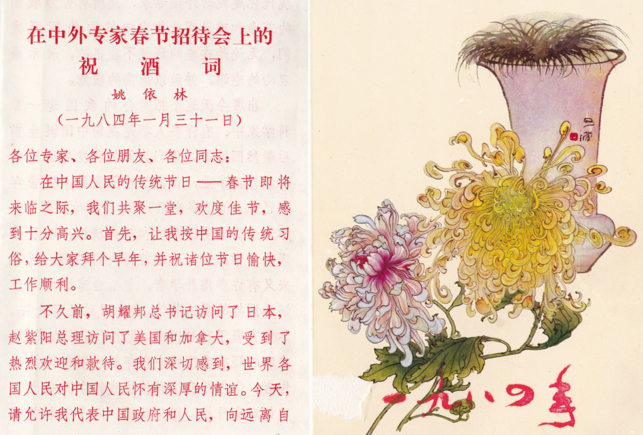 式辞は姚依林という副首相が出てきて行なっていた. (その時,英語の通訳が あったかどうか? なにを喋ったかなどの記憶はない.また, 当日は彼が副首相だとも知らなかった. 2日後に,英語ニュースをみていて,知った.今回 Wikipediaを見たら,鄧小平の路線とは一線を画す 右派の大物で,中曽根首相と会った際に,はじめて 靖国参拝を批判した,そうである). 今,式辞を眺めると,2節目あたりには 胡耀邦が日本を訪問,趙紫陽がアメリカとカナダを 訪問,熱烈歓迎と歓待をうけた,我々は深く感謝,のような 文言が見える.