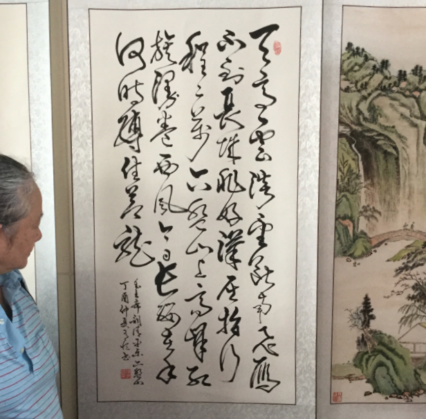 丁さんも書道には入れ込んでいるようで,女房も書道にはまっていることを 知って,かなりの長文の自筆の書をプレゼントしてくれた. 女房はこちらに来て,邪魔なしで書道に打ち込めるとか言って アパートで書き三昧していたのがあるので,それと交換という ことになった.丁さんの話では,予想外なことに任さんも同じ 28号楼にいるとのことであった.あとで黄さんから,任さんは 奥さんがなくなってから,失意で,引きこもり気味になり, 連絡なども取れないが,最近「新しい彼女」ができて元気に 一緒の歩いているのを見た,というような話を聞いた.7月は もう時間がないので,任さんと会うのは9月に来た時にトライして みることにした.