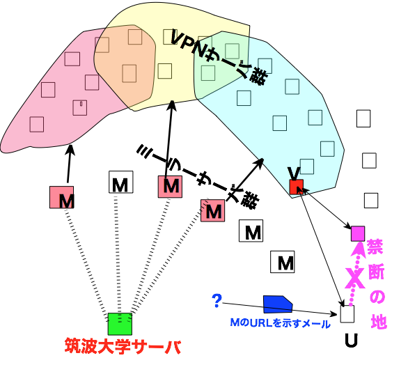 そのメールはメーリングリストに登録すると日に三度ほどメールが送られてくる. そこにはミラーサイトのWebページ(M)のURLが5つくらい載っているが, まずそのWebページへ繋がらない.繋げるにはVPNを かまさないとダメというジレンマに陥る. ただ全てがダメではなく,20ほど試した うちの1つは繋がったことがる.監視網にまだもれがあるということだろうか.